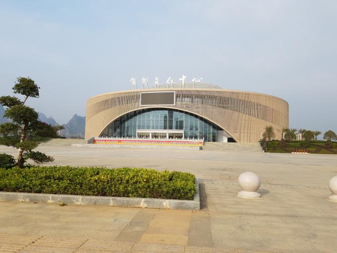 賀州市文化中心建設項目位于城東新區太白東路旁,整個建筑形體呈正圓形。項目開工時間為2012年2月3日,項目計劃總投資31300萬元,設計高度23.8m,總建筑面積33621㎡,占地117.7畝。建設內容為局部地下二層及地上五層建筑,內含1355個座位大劇院,影院、音樂廳、學術報告廳、會議室等8個功能廳,以及公共服務、車庫用房,室外臺座,290個車位生態停車場及綠化工程等。